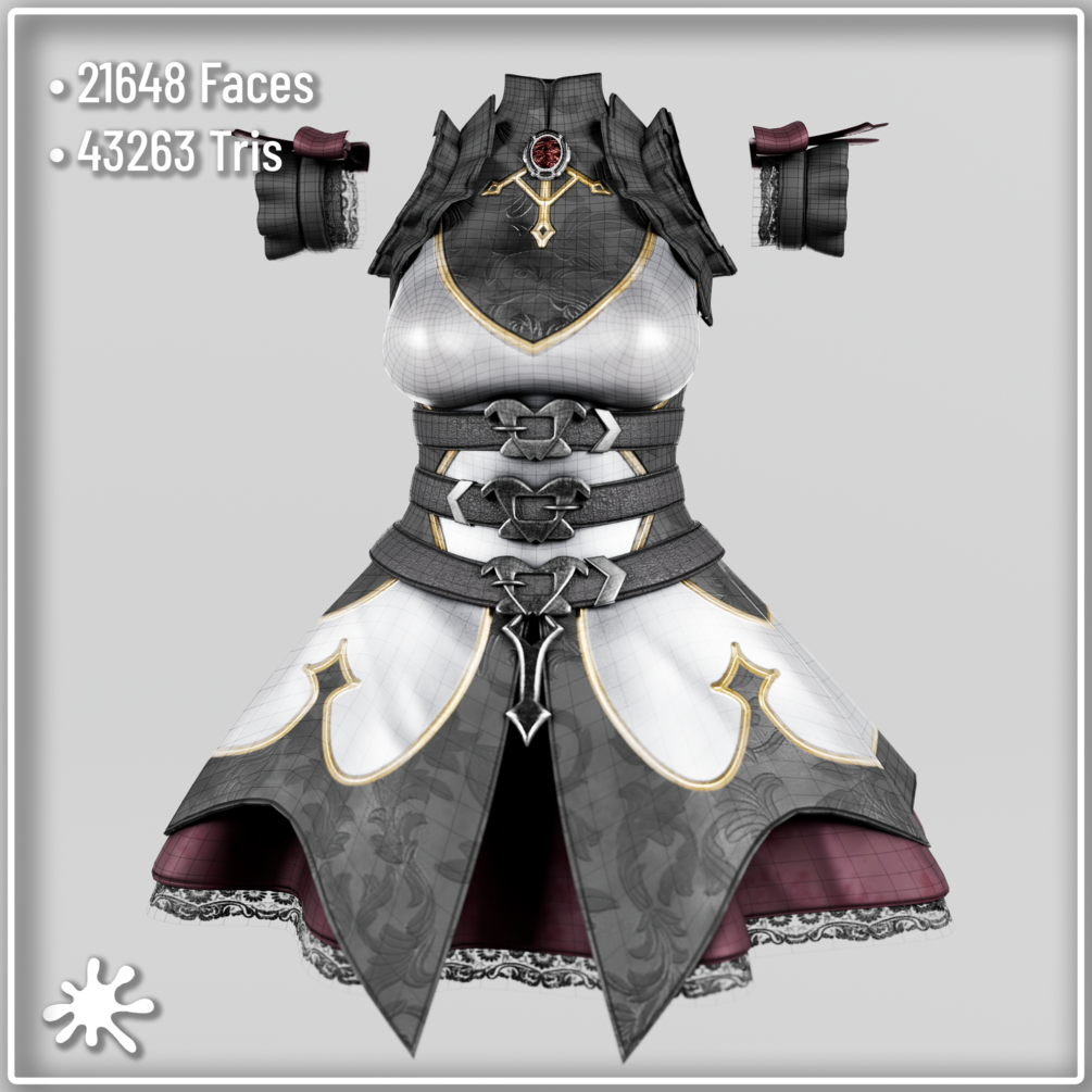 The Royal Knight Dress is rigged to zinfit base, weight painted, uv mapped and textured and has clean topology.